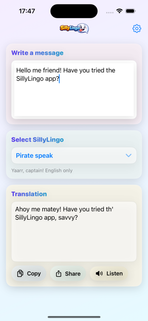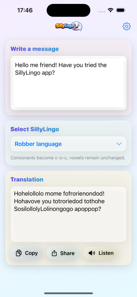 SillyLingo – a playful text transformer featuring multiple fun pseudo languages such as Robber language, Pig Latin, Pirate speak and many more.